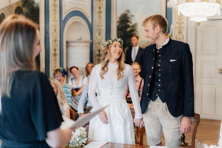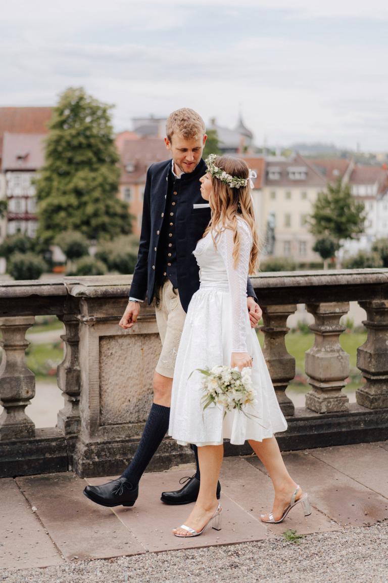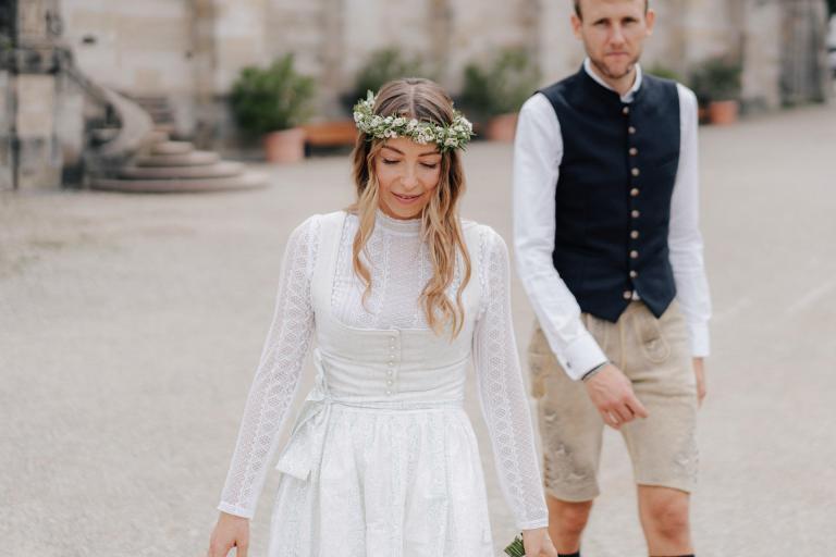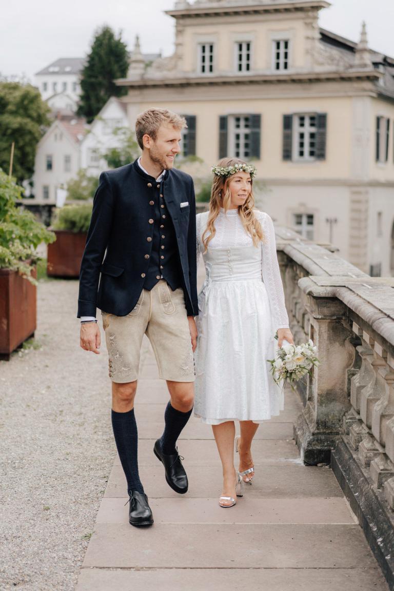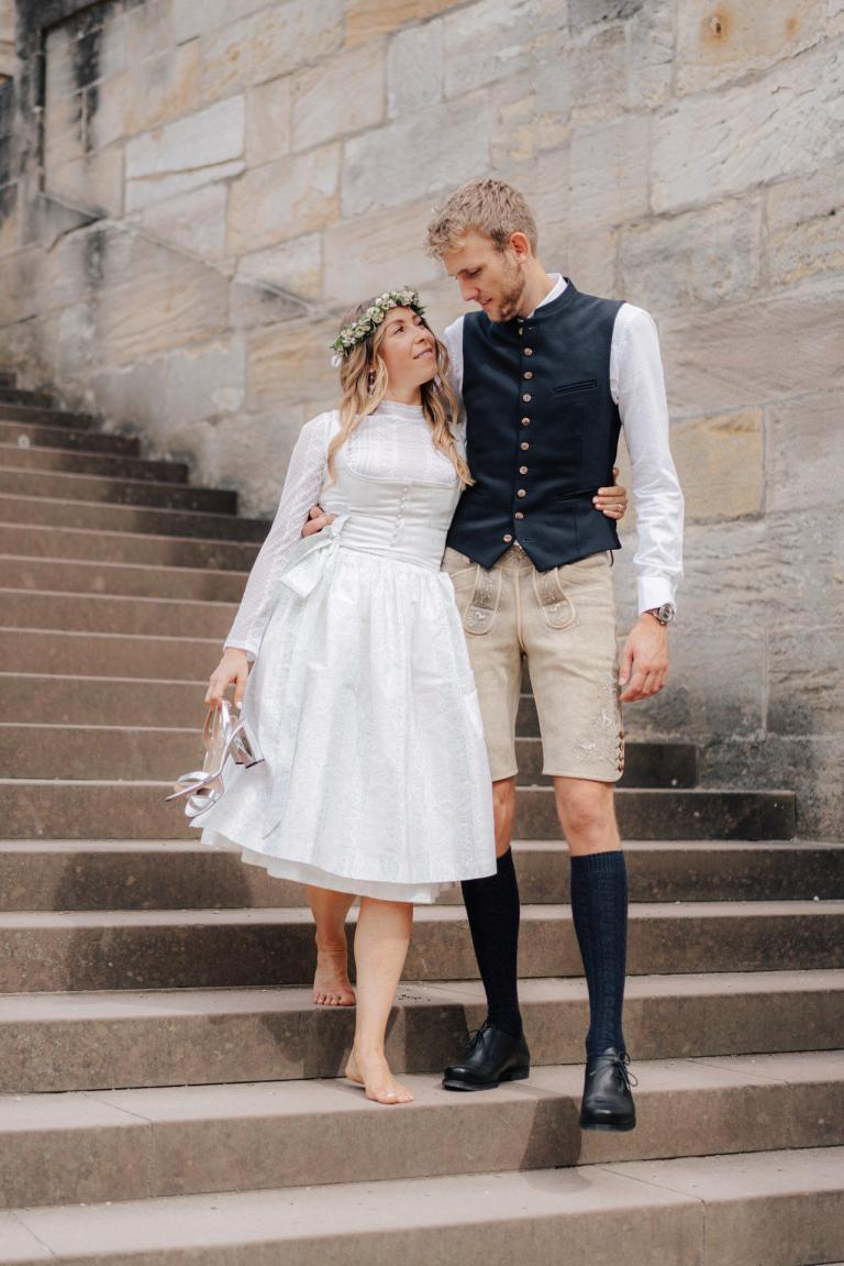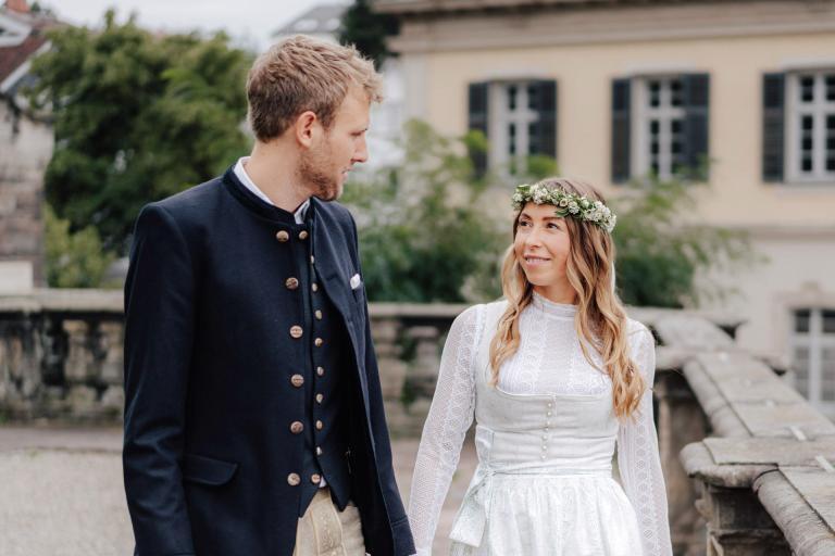 Xenia und Patrick haben sich im Sommer 2023 im Standesamt Coburg, genauer gesagt im charmanten Bürglaßschlösschen, trauen lassen. Die beiden haben sich für diesen besonderen Tag in schicke bayerische Tracht geworfen – Xenia in einem eleganten Dirndl und Patrick in traditioneller Tracht mit Lederhosen.