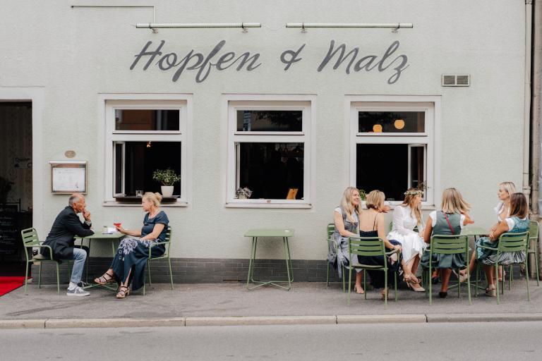 Nach der Trauung ging es für die Hochzeitsgesellschaft zum Sektempfang ins nahegelegene Restaurant „Hopfen und Malz“. In entspannter und lockerer Atmosphäre wurde gefeiert, gelacht und auf das frisch vermählte Paar angestoßen. Hierbei hatten wir auch die Gelegenheit für kurze Zeit zusammen zu verschwinden und ein paar schöne Brautpaarbilder zu schießen. Xenia und Patrick waren ein super eingespieltes Team vor der Kamera und wir hatten eine Menge Spaß beim Shooting. Es ist immer etwas Besonderes, wenn ein Paar so viel Freude und Leichtigkeit ausstrahlt und am dann Ende ganz tolle Erinnerungen zustande kommen.
